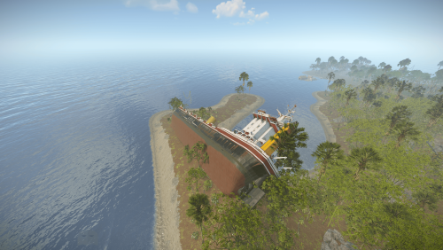 A crashed cargo ship stranded onshore, filled with valuable loot.