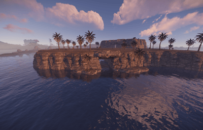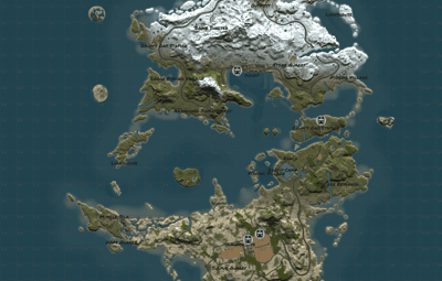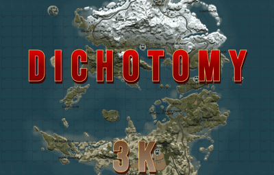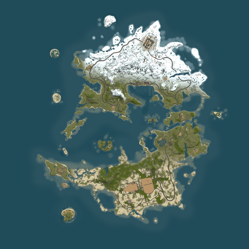 Dichotomy 3K is a rust archipelago style map consiting of 2 main islands with completly different biomes with around 1400 land mass each island and several small islands spread around including 3 building islands and 1 buildable stone structure between the island total map size is 4000 including ocean but only approx 3000 landmass playable.