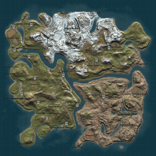 A 6,000 size map that is perfect for every server! The map is divided up by 3 primary regions, the first region is Desolate with sand dunes and a radiated pond that the local Cobalt Sphere has been using as a run off from there cooling pipes. Venture north where your met with cold and treacherous landscapes. As you venture the winter island you will find your self upon a thick forest full of life and possibilities. This map has custom buildable caves only marked with hobo barrels, and custom buildable Oreos Pit Stop's, that come with a complimentary working oil refinery and recycler.