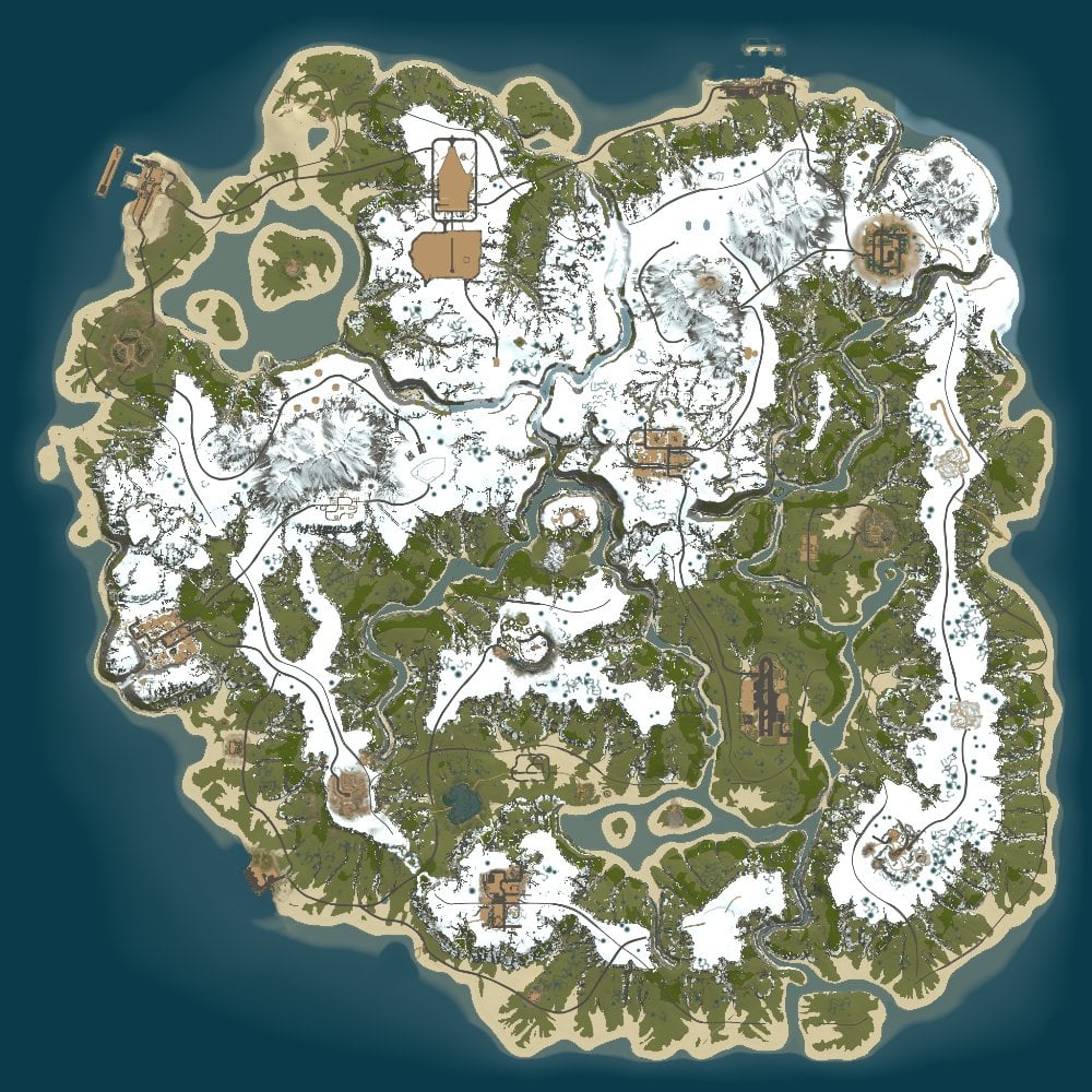 Global warming has reached another eternally frozen island in the depths of the Arctic, glaciers began to melt and once forgotten monuments built by the former owners of the island appeared from under the ice. This island was recently a piece of ice, but now you can see life and a magnificent landscape on it, which has been worked out to the smallest detail. The remains of monuments from a past civilization will not let your players get bored. Cracks have formed in the ice, creating canyons in which you can find a large amount of resources and loot underwater. This map is not like all my other maps, here I decided to pay special attention to the landscapes, the erosion of the earth has created many places to build a base, rivers with fresh water and open spaces for roads and railways. Dive under the water in the icy gorges and you will find valuable loot. This island is also decorated with Christmas garlands and other Christmas paraphernalia. I wish you a Merry Christmas and a Happy New Year, I hope this map will bring you joy, good luck fighters!