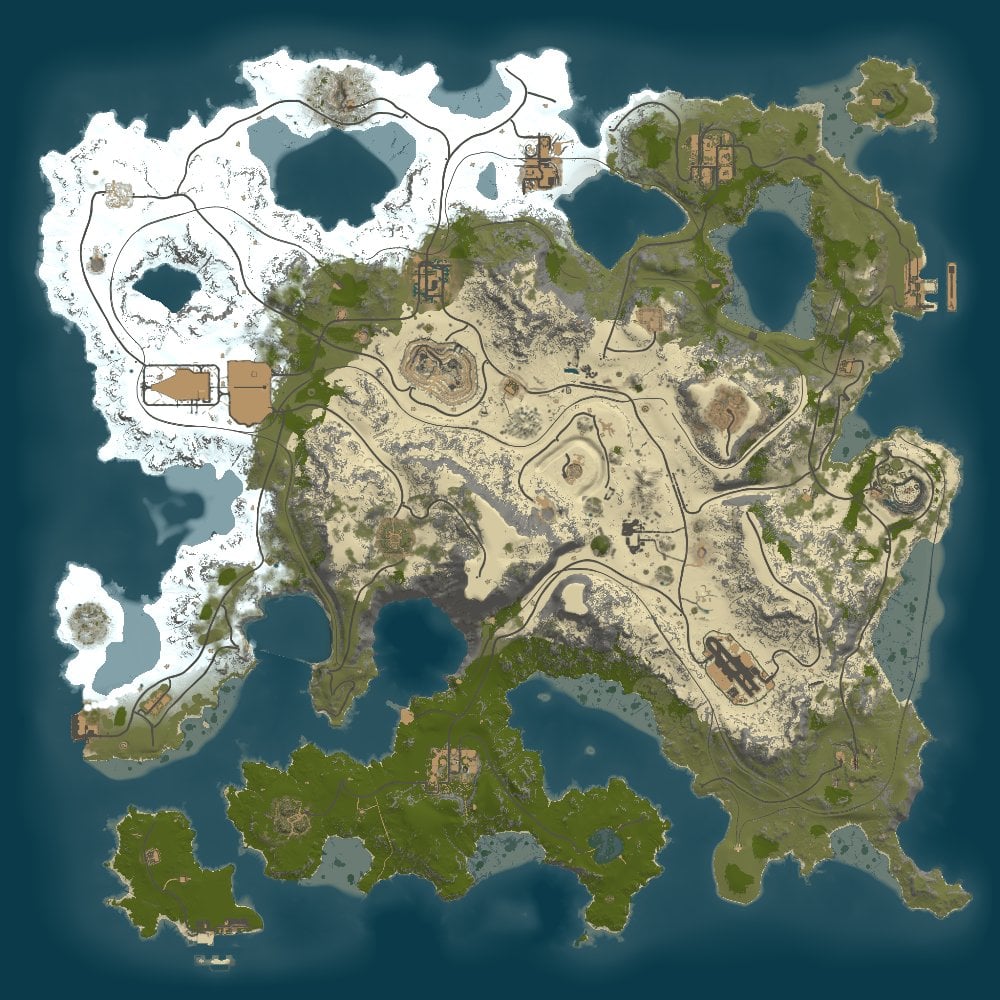 The near future, the planet has suffered a global ecological catastrophe, the sun has burned out most civilizations and green nature. All that remains are the ruins of an old civilization. People turned into looters and raiders, they created several factions of their own and started a war with each other for the most significant resource on this planet - Gasoline. This resource allows gangs to move around a huge island in search of new production, most of the oil fields are captured by raiders, their bases are everywhere, on land, on water. The city located on this island was sunk and its new inhabitants became Sharks. I present to your attention a new map in the post-apocalyptic wasteland style, here you will find many custom locations, more than 20, locations are located everywhere, on land, on water, underground. You will also find some great places to build your base, a huge number of bridges, ziplines will give you the opportunity to quickly move between the peninsulas. You can also buy a flight transport at the outpost. The relief map also offers the use of parachutes to overcome long distances. Drinking water in the bays will give you the opportunity to quench your thirst and build a farm. Good luck in surviving on this island!