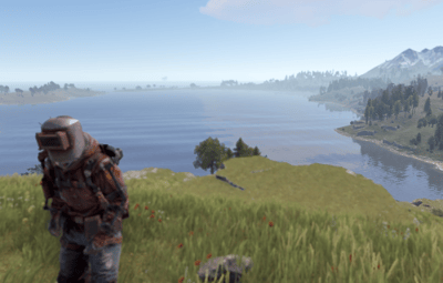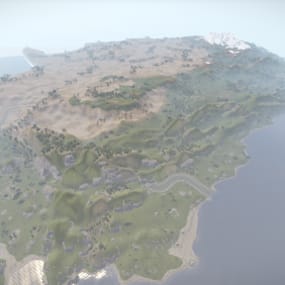 Custom heightmap with standard FacePunch Monuments, and building limited to the Southern Island. This is done so that monuments and loot cannot be camped, and creates a PvP hot zone at the ocean separating the two islands.