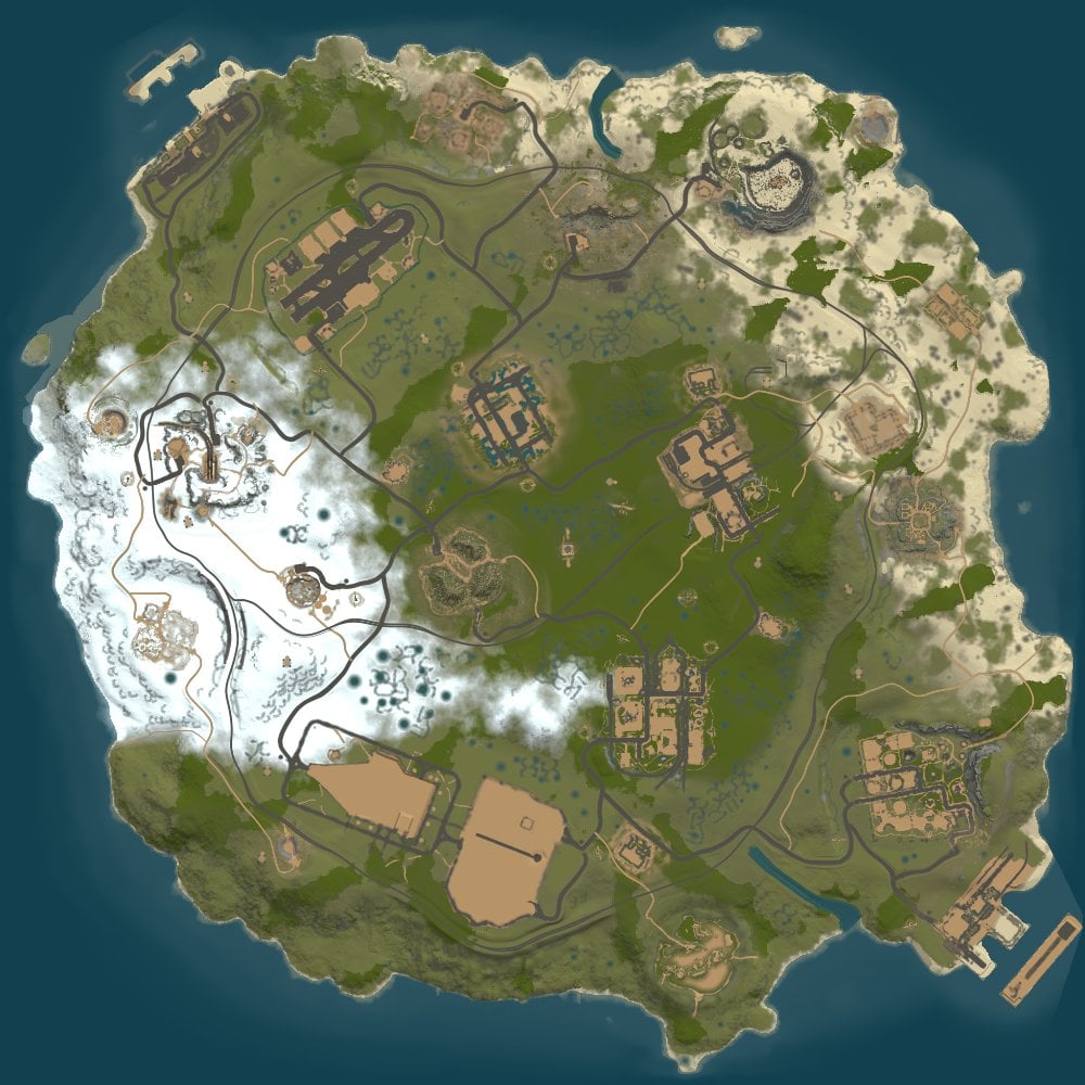 The diverse terrain ranges from lush forests to arid landscapes and rugged coastlines, complemented by gentle hills, deep valleys, and elevated plateaus. Key monuments such as the Military Base, Military Tunnel, Launch Site, and others are strategically placed, offering coveted locations for looting, trading, and engaging with other players.