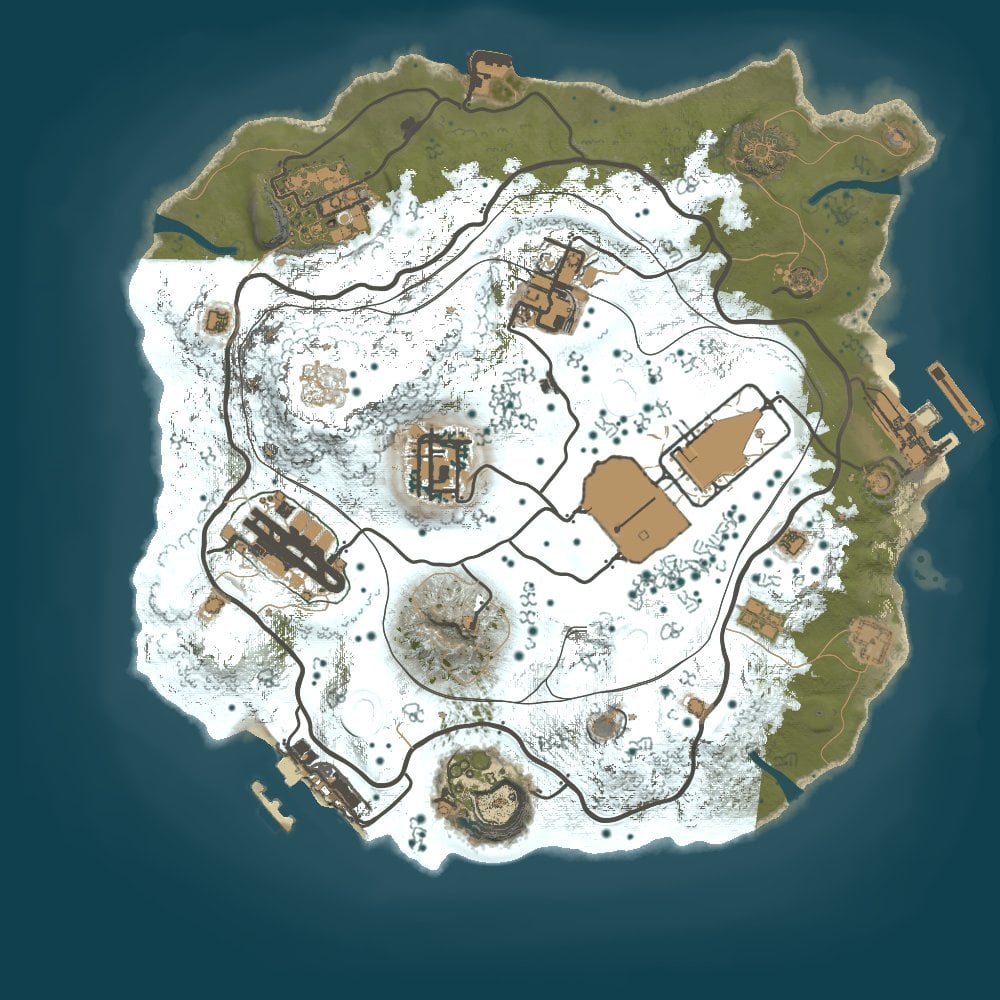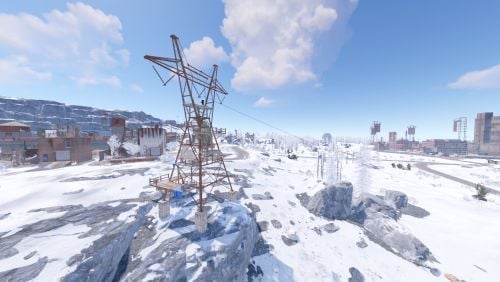 The Rust map, set at 2500 size in its vanilla state, provides players with an intense and challenging experience, with the particularity that most of its landscapes are covered by a white blanket of snow. From lush forests to arid deserts and rugged coastlines, the diverse topography of this environment is accentuated by the presence of extensive snowy areas.