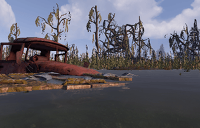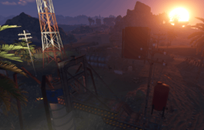 Custom monuments: Broken Drilling rig, Car Repair shop, tower.