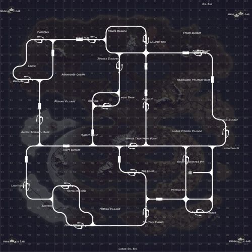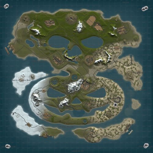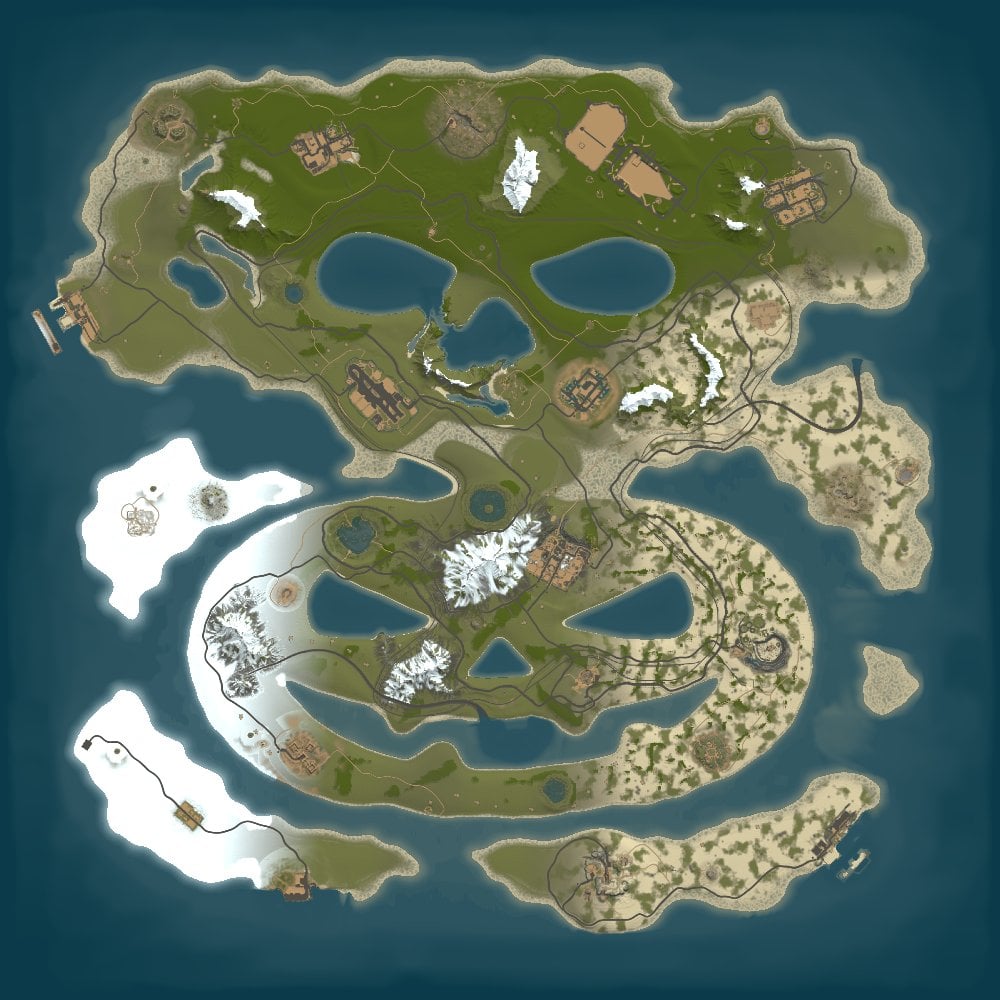 The terrain is carefully laid out: snowy regions to the west and south, desert areas to the east, and large green and jungle areas to the north and center, creating a balance between exploration, looting, and combat. Key landmarks such as the Airfield, the Launch Site, the Military Base, the Port, and the Dome are strategically placed in different sections of the "skull" and "jawbone," encouraging both mobility and tactical engagements.