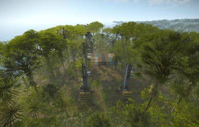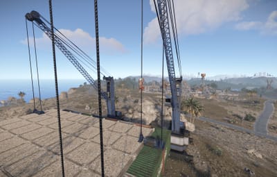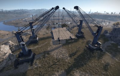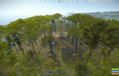 Four towering cranes hold up a buildable area made of containers — industrial, bold, and practical.