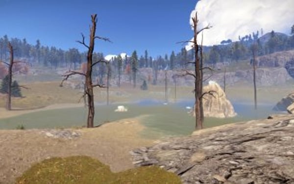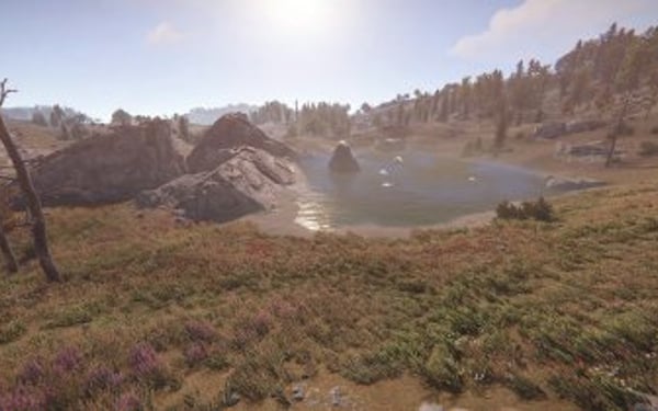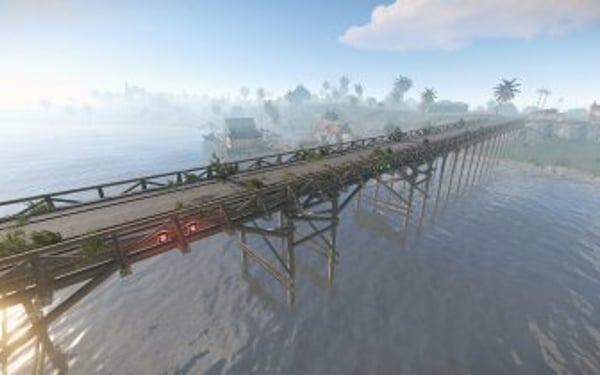 Players can find wooden piers near the water where they can fish or just enjoy the view.