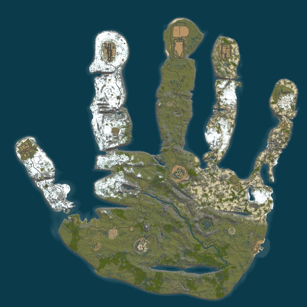 A 5,000k map that boasts large monuments on the tip of each finger, with an array of bridges to connect you. With one major river, there are numerous bodies of water that are drinkable and huge areas that allow building. This map is perfect for server with large populations and even dare a type of "King of the Hill" to control each finger.