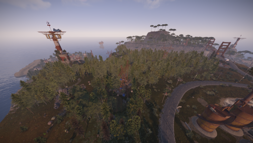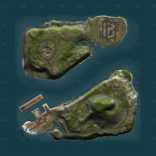 A simple nicely laid out 1 grid map (1000 Map Size) split in 2 separate islands with high hills with nice and unique spots for action to take place