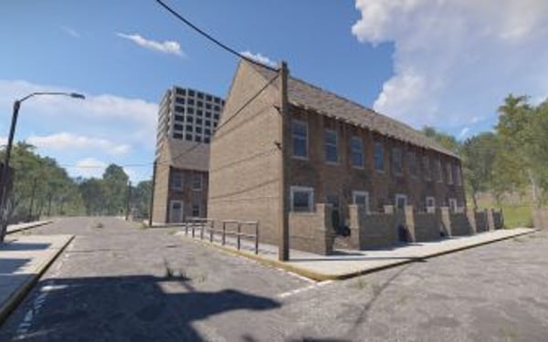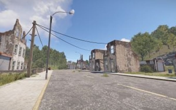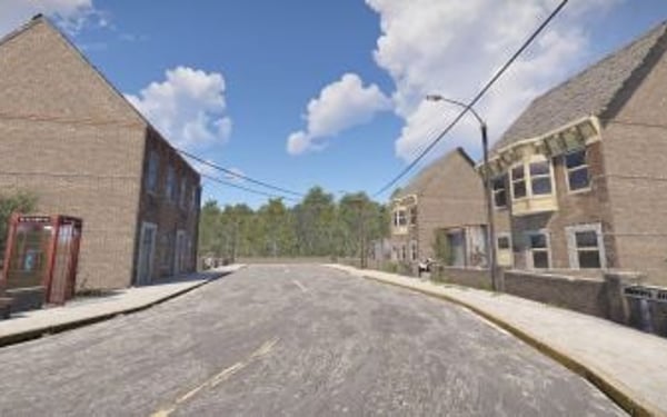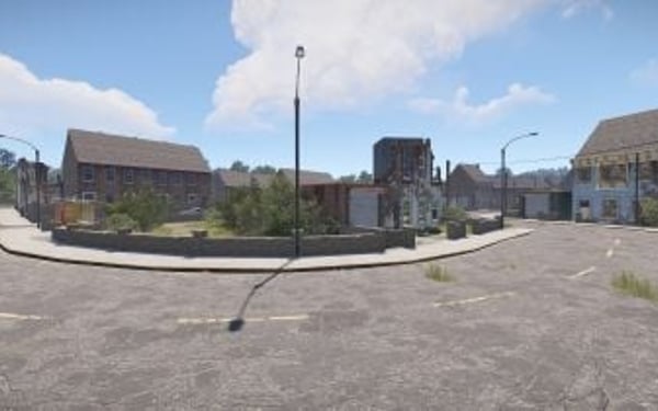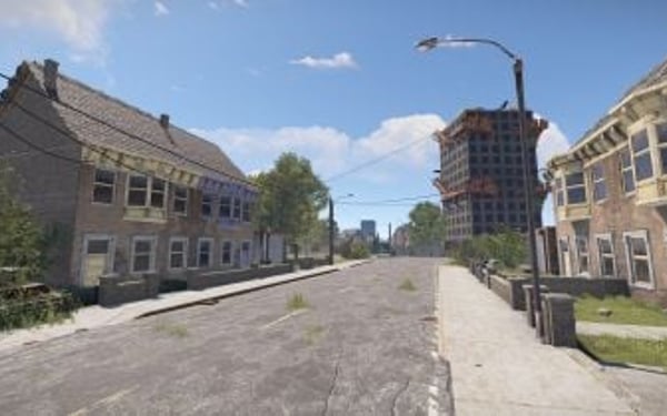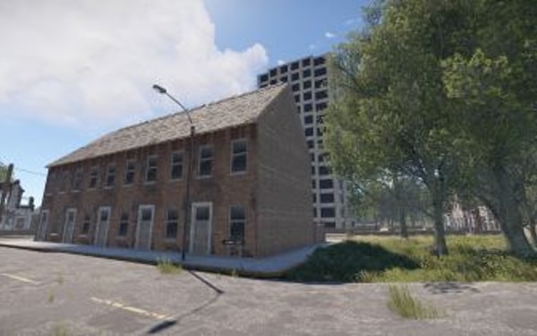 Houses, Ruined Houses, Boarded Rowhouse, High-rise buildings, Petrol Stations, Bus Stops
