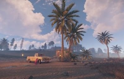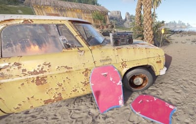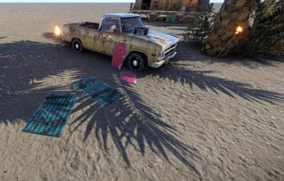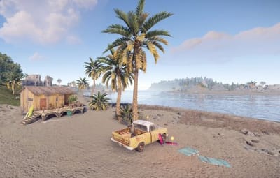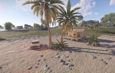 This mall beach monument is composed of a bar and a small scene with a puck up truck from Tahuata. Inside the bar there is a working radio, 2 poker tables and decoration. 2 basic crates and one normal crate underneath the bad. The radio on the pick-up truck works as well.
