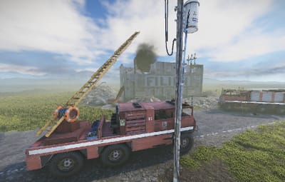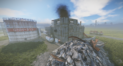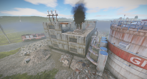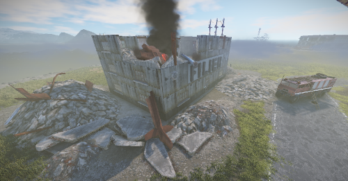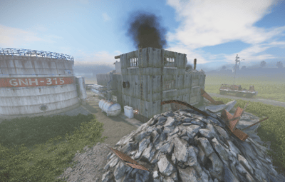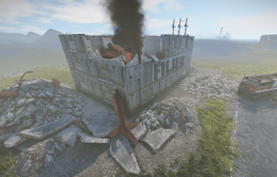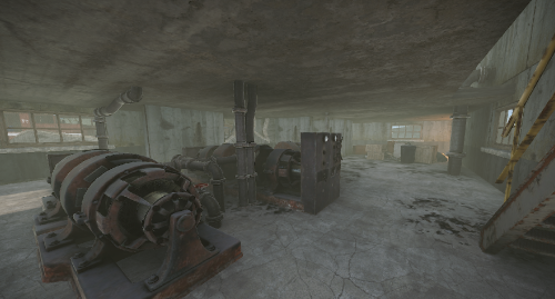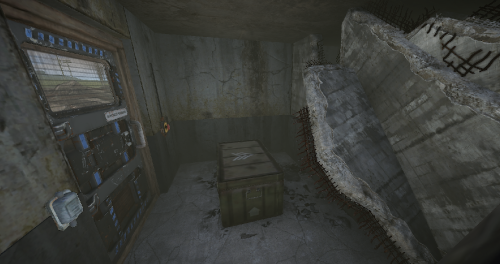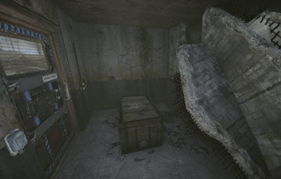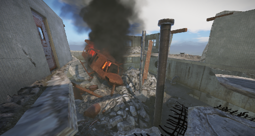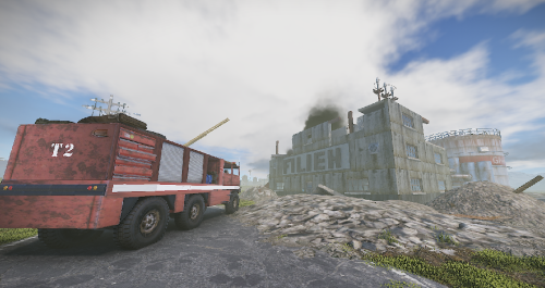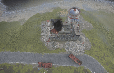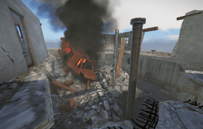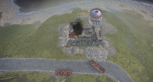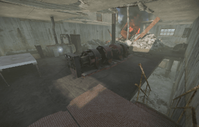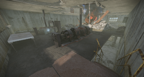 a burning house. the fire brigade is already there, or was there... a helicopter crashed into the factory building and it looks like everything is broken anyway. you can open a door with a blue card to get a good loot chest. at the back of the building you will find a ladder that will take you upstairs.
