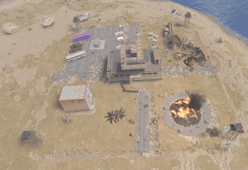 Inspired by a car scrapyard, this monument is perfect for large or small maps, thanks to the fact that it has enough loot, the possibility of taking all 3 cards and much more.