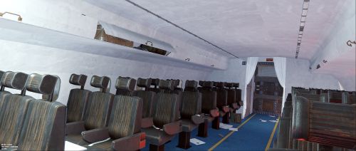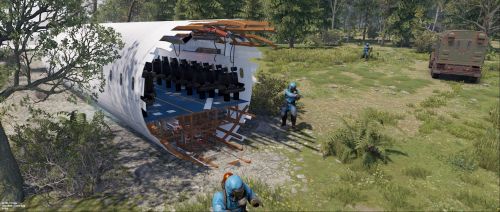 Welcome to the Plane Crash Rear Monument. Here, you will find the rear segment of an airliner, ripped apart and crashed, surrounded by trees that are either burnt to a crisp or knocked over. Upon arriving at the site, you will discover that a Cobalt team has beaten you to it. You must eliminate them before you can search the wreckage. Inside, you will find loot, including a locked blue card door that grants access to the cargo compartment, where even more loot await. This monument is loosely based on a plane crash from The Forest.