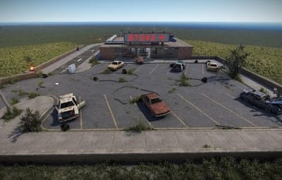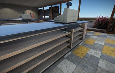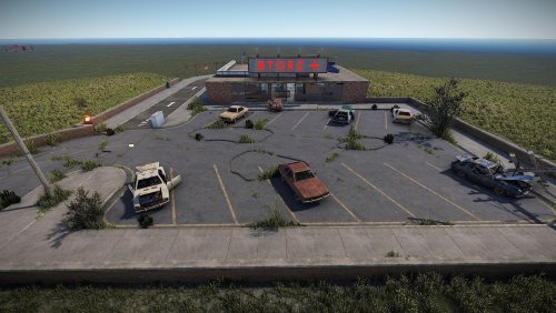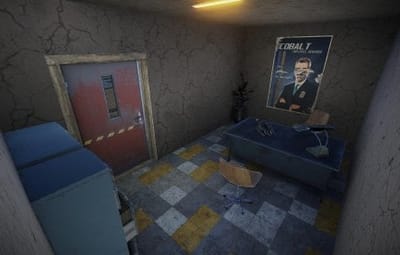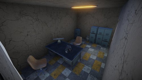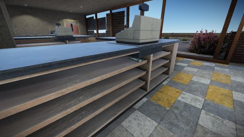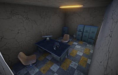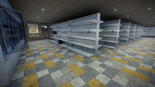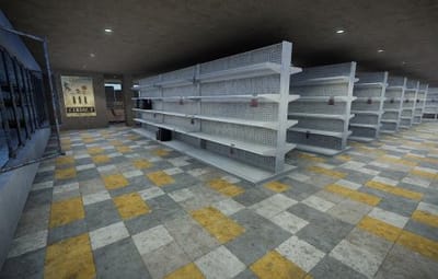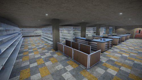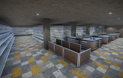 Small abandoned grocery store with 2 scientists carefully guarding 2 puzzle maps which are hidden in the store.