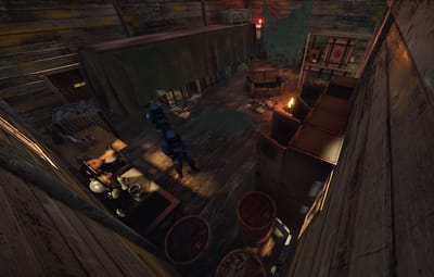 - Some scattered crates, a toolbox and barrels outside rooms.