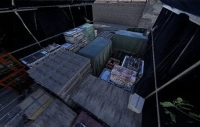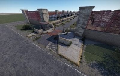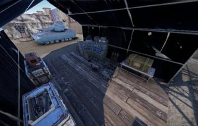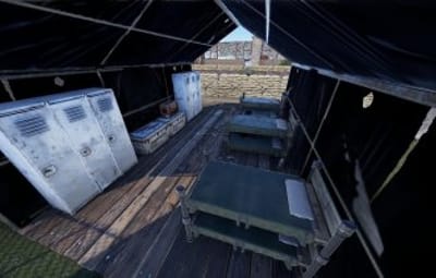 - Military camp, open design, with NPC spawns above ground and underground in Blue keycard room.