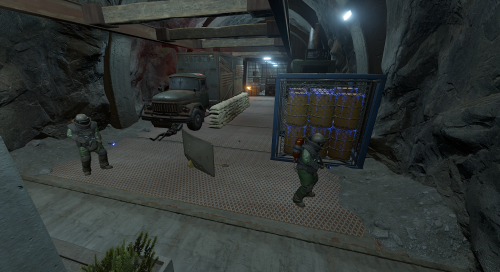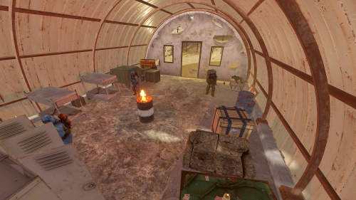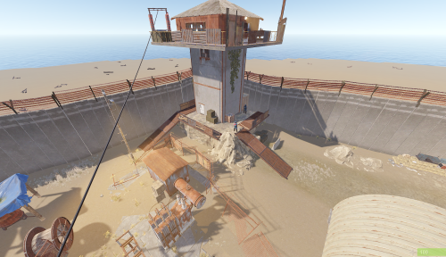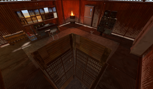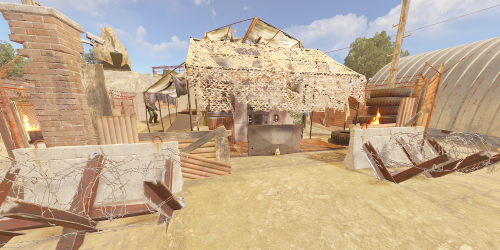 Hand Built abandoned Military Complex. Has 3 blast door entrances, a bunker, green, blue and red card rooms. Bradley patrols outer perimeter. has many loot box spawns, has over 30 scientists protecting complex. has MLRS vehicle. Bunker vault system where player has 500 seconds to loot and escape before being locked inside. It Has over 7 Cameras and 2 computer stations. Doors have sirens for people to know if anyone is leaving or coming.