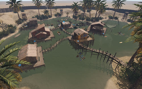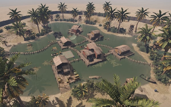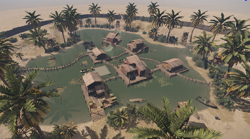 A Stunning Desert Oasis: A beautifully designed village built around a natural spring, offering immersive atmosphere and visuals.