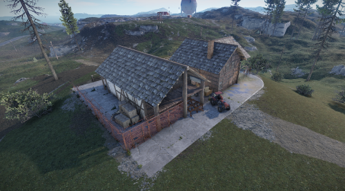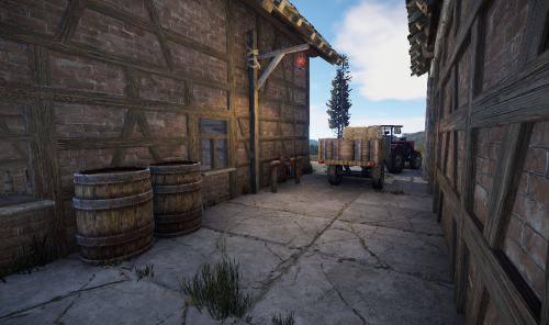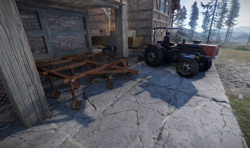Here comes the farm in which there are two tractors, a field cultivator and a trailer. There is a kitchen in the house and a recycler in the barn.