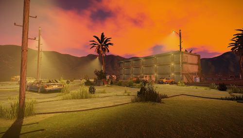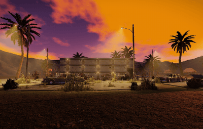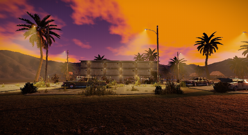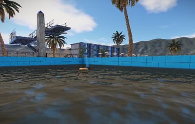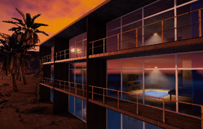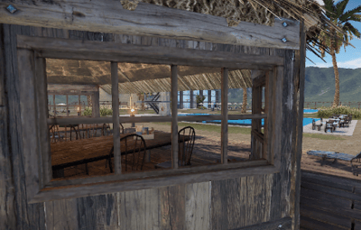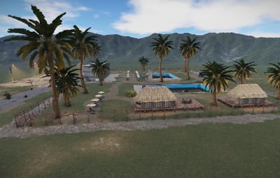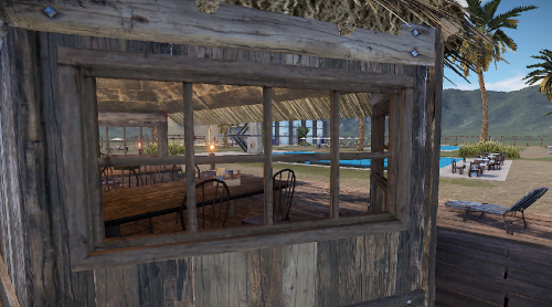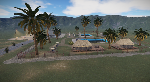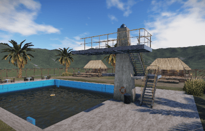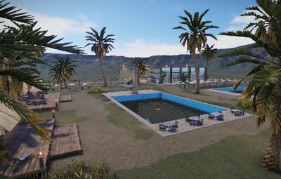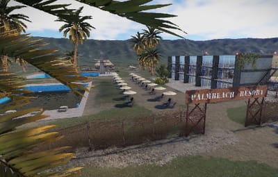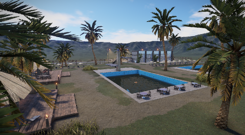 The Palm Beach Resort is a replica of the seventies. Two pools with diving board. On the side are two bars and a food counter opposite.