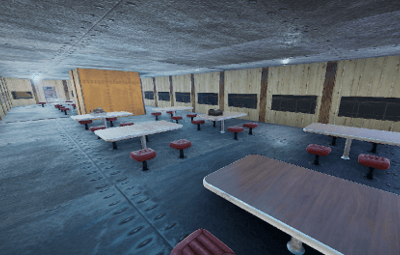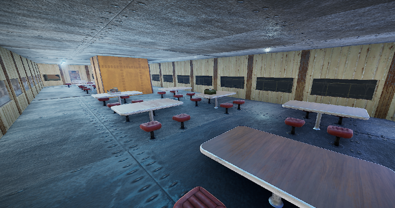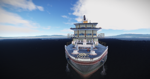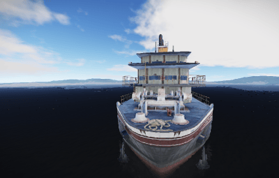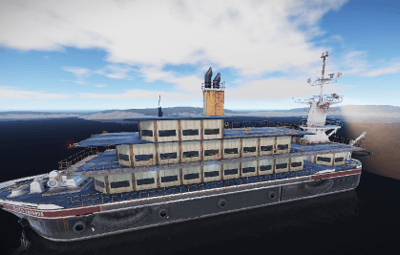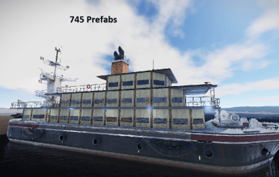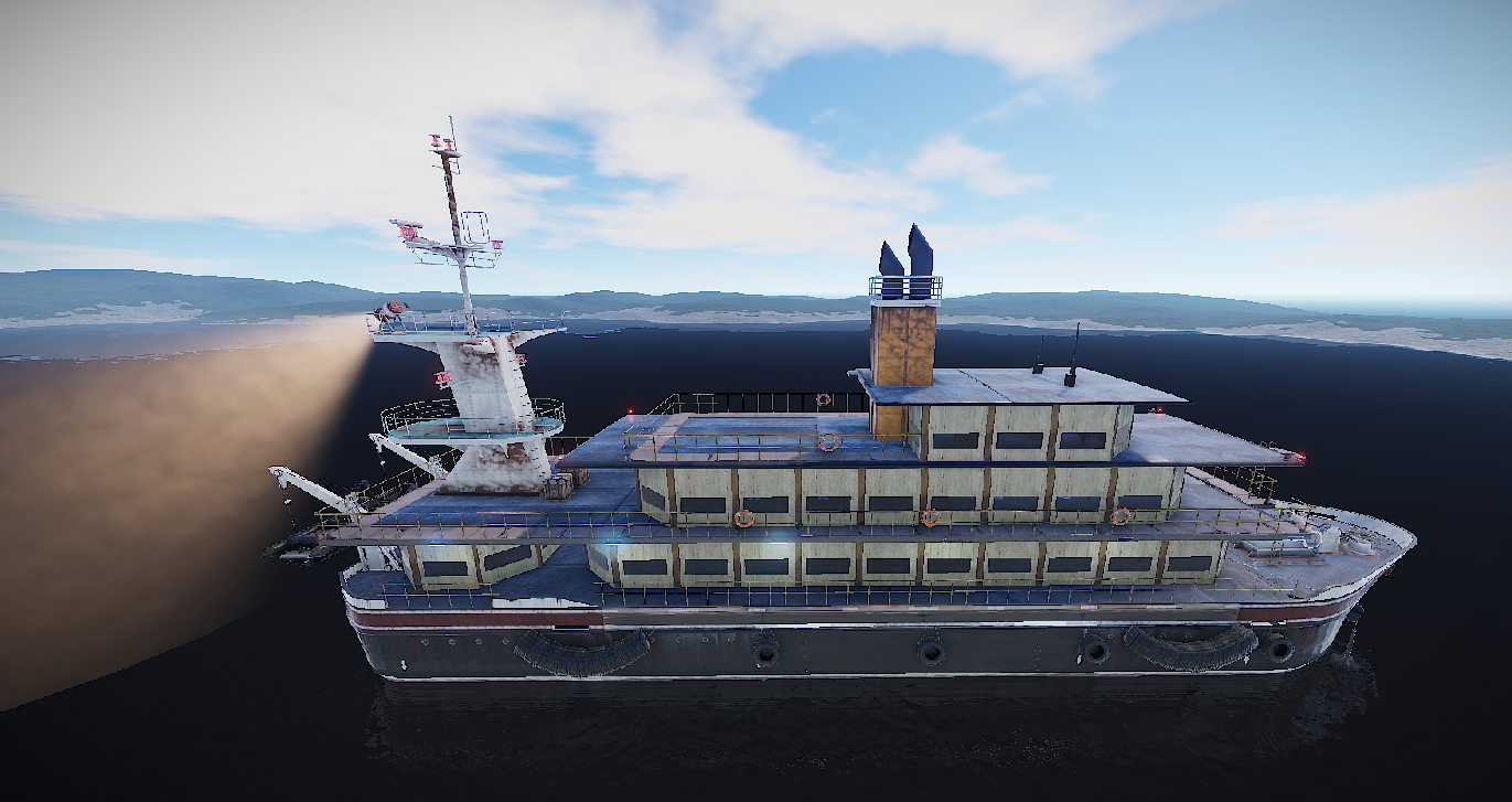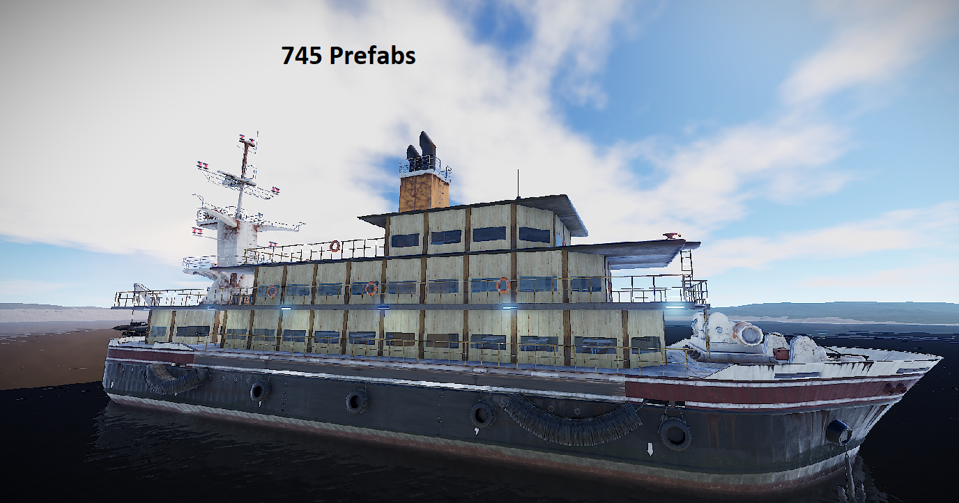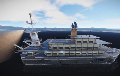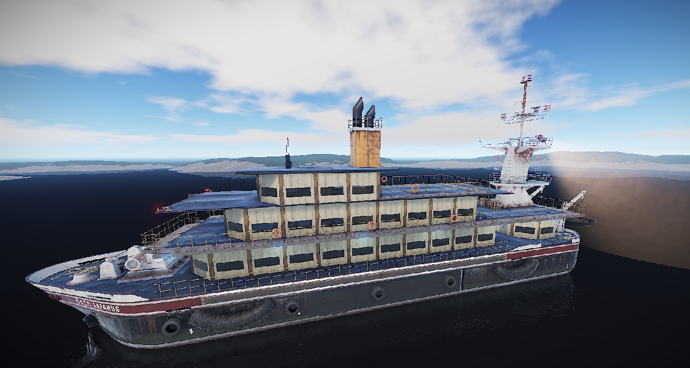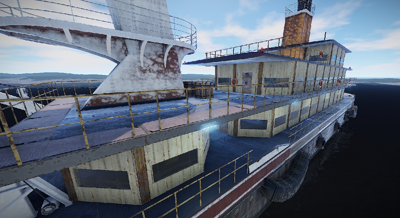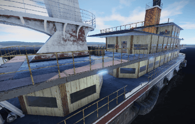 A passenger ship with some loot boxes on board. at the back of the ship the player will find a ladder to get on the ship. ladders lead to the individual compartments.