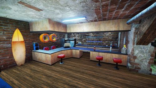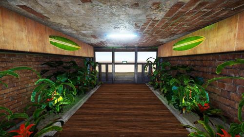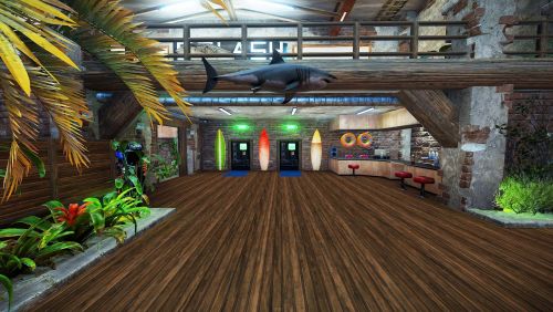 Dive into the glowing, crystal-clear pool illuminated by neon under lights. Lounge beneath tropical palms and parasols on the warm wooden deck, with sleek blue recliners inviting you to kick back and soak in the ambiance. Need a break from the pool? Grab a drink and chill under the mezzanine balcony, where cozy seating and greenery bring peaceful shade and a breath of fresh air.