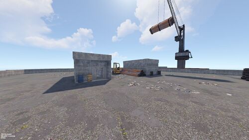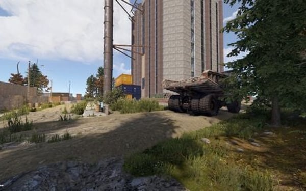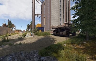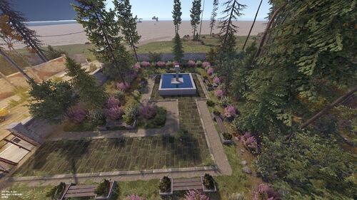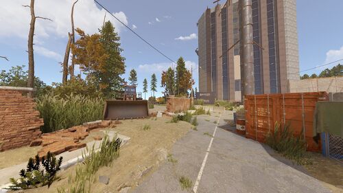 The area also includes a small park with a fountain, creating a stark contrast to the industrial surroundings.