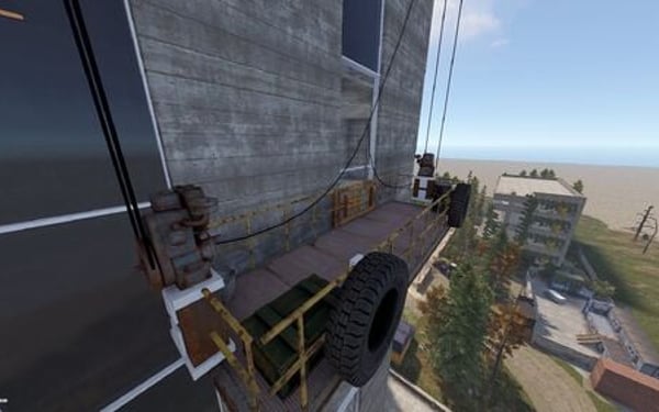 This monument features a nine-story central building styled as an unfinished high-rise under construction.