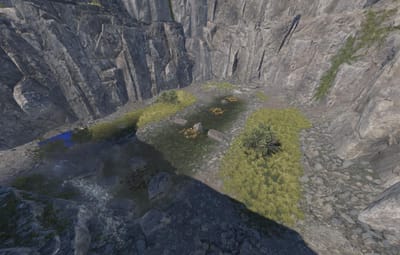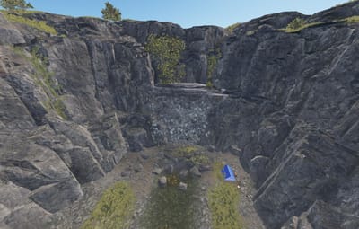 - Waterfall with cliffs, and below a small river with some food spawns.