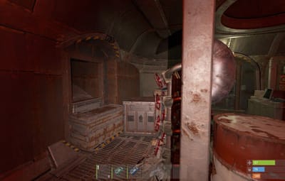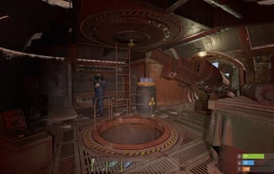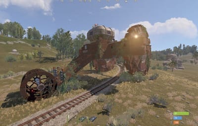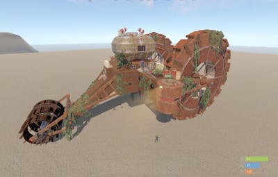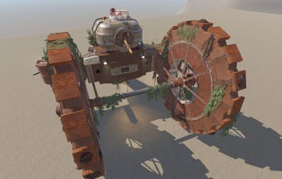 A colossal wheel-legged war machine looms over the terrain with its bizarre, towering silhouette and rust-choked frame. This mini-monument features multiple traversal routes across its massive hull. Entering through the ventilation system, players will discover two core chambers based on underwater lab modules with dynamic, procedurally generated interiors. Access to two additional rooms requires both green and blue keycards, combined with classic puzzle-style mechanics -- the blue room is unlocked via the green one, rewarding observation and exploration.