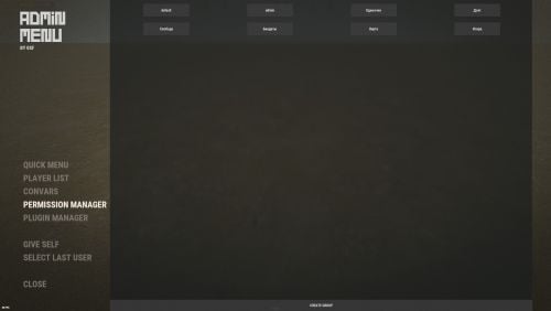 - adminmenu.use - Ability to use admin menu with basic set. Open tab quick menu (each button has its own permission, without permissions is present only kill yourself button) and the list of players.