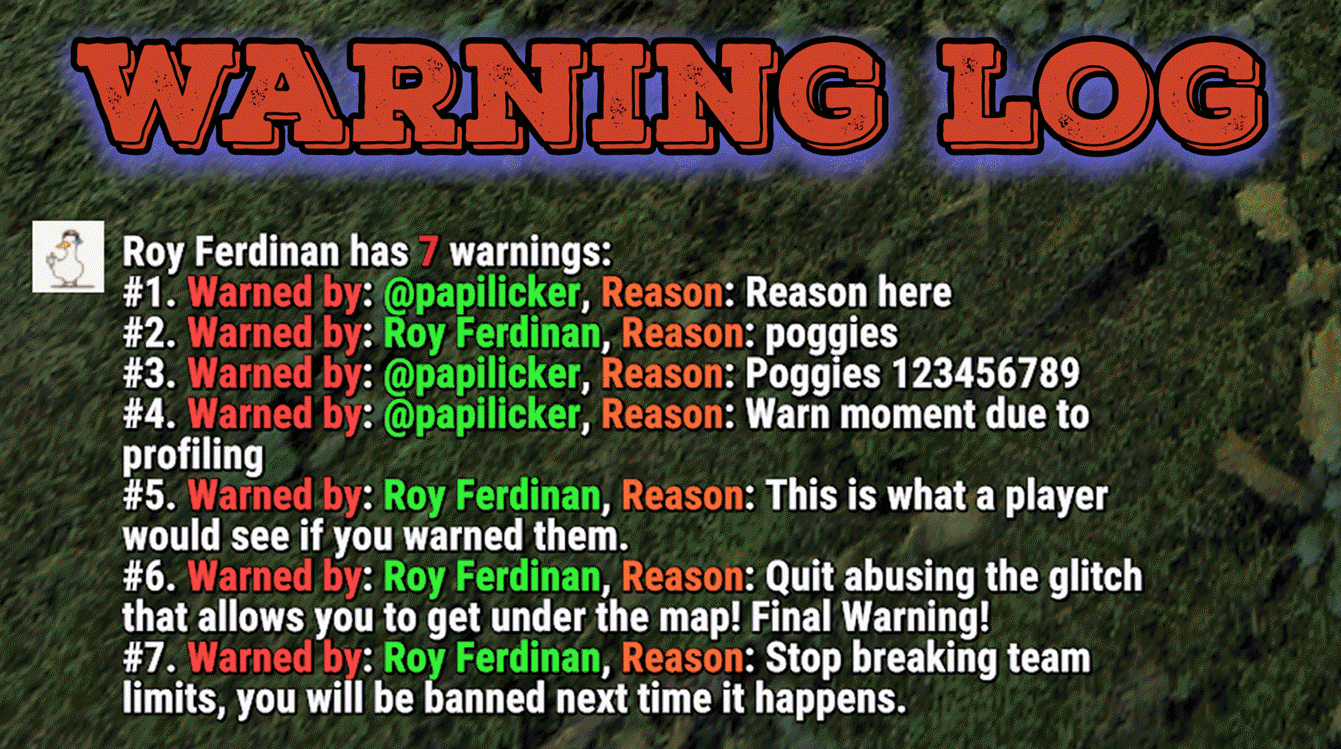 Commands/ban <player name or id> [reason] || Bans a player permanently. /unban <player name or id> || Un-bans a player. /kick <name or ID> [reason] || Kicks a player. /tempban <player name or id> <2h/5d/6w/1m/9y> [reason] || Temporarily bans a player for the specified time. /warn <player name or id> <reason> /removewarn <player name or id> <warn #> || Removes a player's warning. || (alias: /warnremove) /addwarn <player name or id> <reason> || Adds a warning to a player. || (alias: /warnadd) /clearwarns <player name or id> || Clears a player's warnings. || (alias: /warnclear) /watchlist active || Displays connected players on Watchlist. /watchlist players || Displays all players on Watchlist. /watchlist add <player name or id> <reason> || Adds a player to the Watchlist. /watchlist remove <player name or id> || Removes a player from the Watchlist. /rename <player name or id> <new name> || Changes a player's name to the inputted name. /resetname <player name or id> || Resets a player's name back to their steam name. /renamed players || Shows the list of renamed players. /renamed active || Shows the list of connected players who are renamed. /id <player name or id> || (alias: /playerid, /userid) /inventory view <player name or id> || Loot/view a player's inventory. /inventory backpack <player name or id> || Loot/view a player's inventory. /inventory clear <player name or id> || Clear a player's inventory. /inventory toggle || Toggle inventory viewing via RELOAD key. /permission grant user <player name or id> <permission> || Grants player a permission. /permission grant group <player name or id> <permission> || Grants group a permission. /permission revoke user <player name or id> <permission> || Revokes a player's a permission. /permission revoke group <player name or id> <permission> || Revokes a group's a permission. /load <plugin name> || Loads a plugin (if unloaded). /unload <plugin name> || Unloads a plugin (if loaded). /reload <plugin name> || Reloads a plugin. /group <add/remove> <name or ID> <group> || Add/remove a player to/from a group. /group <create> <group> <group title> || Create a group. /group <delete> <group> || Delete a group. /group <removeall> <group> || Remove all players from a group. /fkill <name or id> || Force kill a player. || (alias: /slay, /murder) /wound <name or id> || Force wound (down) a player. || (alias: /fwound) /revive <name or id> || Force revive a wounded player. || (alias: /frevive) /fspawn <name or id> || Force spawn a player. || (alias: /frespawn, /forcespawn) /pop || Shows current pop. /players || Shows connected players. /teaminfo <name or id> || View a players team members. // RUST ONLY /creative <on/off> || Hold middle click to get the item you're looking at. /loot <player name or id> || Loot/view a player's inventory. Font commands for those who have issues displaying fonts in images in Discord. // RCON CONSOLE ONLY /font help || Displays font help relating to discord images. /font list || Displays available fonts. /font set <photo/inv/both> <font name> || Sets the font to the specified font. /font scale <photo/inv/both> <scale> || Sets the scale of the specified type. (ex scale:0.8 or 3.0)