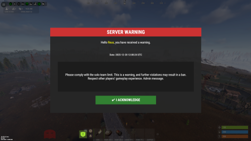 Warnings can be sent via RCON or in-game chat. Player acknowledgment is expected. If the player closes the game or presses ESC, the warning will be shown again until it is acknowledged. No hard movement lock is applied.