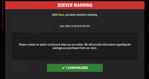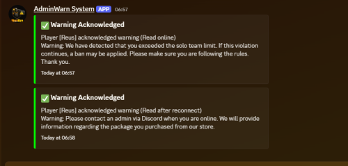 For single-target warnings, messages can also be sent to offline players and are stored until the player reconnects. Discord webhook logs record whether the warning was acknowledged while the player was online or after reconnecting. Global warnings apply only to online players and do not generate any Discord logs to prevent rate limits.