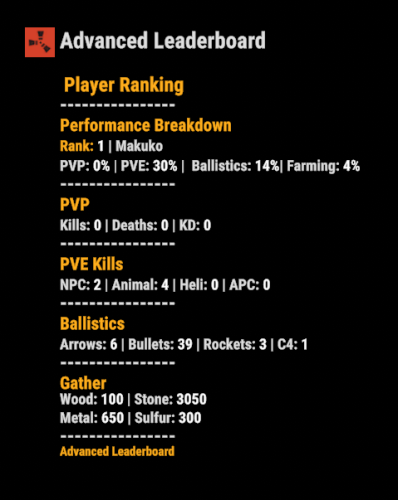 Advanced Leaderboard is the ultimate statistics and ranking plugin for Rust servers, offering comprehensive player tracking across PVP, PVE, Ballistics, and Gathering activities. Give your players meaningful progression tracking and competitive leaderboards that keep them engaged and coming back for more!