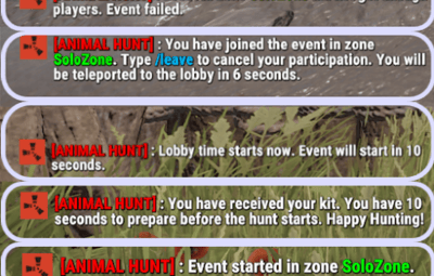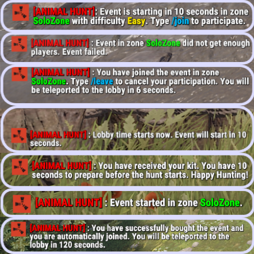 Animal Hunt Event is a dynamic and customizable event system designed to engage players with thrilling hunting challenges. This plugin allows server administrators to create immersive hunting events where players compete against each other in specific zones, hunting dangerous animals for valuable rewards.