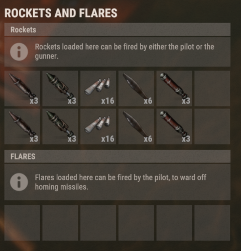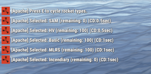 Players can cycle rocket types with the USE key (E) while piloting, and the helicopter will fire the selected rocket type as long as ammo is available. When a type runs out, Apache will announce “out of ammo” and automatically switch to the next available enabled type.