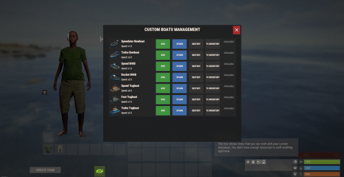 { "Configuration Version": { "Major": 0, "Minor": 0, "Patch": 128 }, "Command Settings": { "Command to get boat": "boat", "Command to list boats": "boatlist", "Show receive message": true, "Automatically place boat in water": true, "Water search radius (meters)": 50.0, "Boat spawn distance from player (meters)": 8.0, "Give cooldown (seconds)": 5.0, "Spawn cooldown (seconds)": 3.0 }, "Display Settings": { "Show boat name": true, "Minimum display distance (meters)": 2.0, "Maximum display distance (meters)": 15.0, "Display update interval (seconds)": 0.2, "Text color (R G B A)": "0 1 1 1", "Font size": 14, "Height above boat (meters)": 2.0 }, "UI Settings": { "UI open command": "boatui", "Panel background color": "0.1 0.1 0.1 0.95", "Button color": "0.15 0.15 0.15 0.95", "Text color": "0.969 0.922 0.882 1", "Active button color": "0.2 0.6 0.8 1", "Panel position AnchorMin": "0.3 0.2", "Panel position AnchorMax": "0.7 0.8" }, "Custom Boats": [ { "Name": "speedster", "Display Name": "Speedster Rowboat", "Base Type": "rowboat", "Speed Multiplier": 1.0, "Permission": "apboatspeed.speedster", "Enabled": true, "Give Mode": "Item", "Base Item for Emulation": "kayak", "Unique Skin ID": 3594815869, "Give Cooldown (seconds)": 15.0, "Spawn Cooldown (seconds)": 10.0, "Image File Name (without extension)": "speedster" }, { "Name": "turbo", "Display Name": "Turbo Rowboat", "Base Type": "rowboat", "Speed Multiplier": 2.0, "Permission": "apboatspeed.turbo", "Enabled": true, "Give Mode": "Item", "Base Item for Emulation": "kayak", "Unique Skin ID": 3594816585, "Give Cooldown (seconds)": 10.0, "Spawn Cooldown (seconds)": 7.0, "Image File Name (without extension)": "turbo" }, { "Name": "speedrhib", "Display Name": "Speed RHIB", "Base Type": "rhib", "Speed Multiplier": 1.0, "Permission": "apboatspeed.speedrhib", "Enabled": true, "Give Mode": "Item", "Base Item for Emulation": "kayak", "Unique Skin ID": 3594816888, "Give Cooldown (seconds)": 5.0, "Spawn Cooldown (seconds)": 3.0, "Image File Name (without extension)": "speedrhib" }, { "Name": "rocketrhib", "Display Name": "Rocket RHIB", "Base Type": "rhib", "Speed Multiplier": 2.0, "Permission": "apboatspeed.rocketrhib", "Enabled": true, "Give Mode": "Item", "Base Item for Emulation": "kayak", "Unique Skin ID": 3594817179, "Give Cooldown (seconds)": 7.0, "Spawn Cooldown (seconds)": 5.0, "Image File Name (without extension)": "rocketrhib" }, { "Name": "speedtugboat", "Display Name": "Speed Tugboat", "Base Type": "tugboat", "Speed Multiplier": 0.5, "Permission": "apboatspeed.speedtugboat", "Enabled": true, "Give Mode": "Item", "Base Item for Emulation": "kayak", "Unique Skin ID": 3594817448, "Give Cooldown (seconds)": 4.0, "Spawn Cooldown (seconds)": 2.0, "Image File Name (without extension)": "speedtugboat" }, { "Name": "fasttugboat", "Display Name": "Fast Tugboat", "Base Type": "tugboat", "Speed Multiplier": 1.5, "Permission": "apboatspeed.fasttugboat", "Enabled": true, "Give Mode": "Item", "Base Item for Emulation": "kayak", "Unique Skin ID": 3594817649, "Give Cooldown (seconds)": 6.0, "Spawn Cooldown (seconds)": 4.0, "Image File Name (without extension)": "fasttugboat" }, { "Name": "turbotugboat", "Display Name": "Turbo Tugboat", "Base Type": "tugboat", "Speed Multiplier": 2.5, "Permission": "apboatspeed.turbotugboat", "Enabled": true, "Give Mode": "Item", "Base Item for Emulation": "kayak", "Unique Skin ID": 3594817910, "Give Cooldown (seconds)": 6.0, "Spawn Cooldown (seconds)": 4.0, "Image File Name (without extension)": "turbotugboat" } ], "Localization Settings": { "Message Prefix": "<color=#00ff00>[APBoatSpeed]</color>" } }