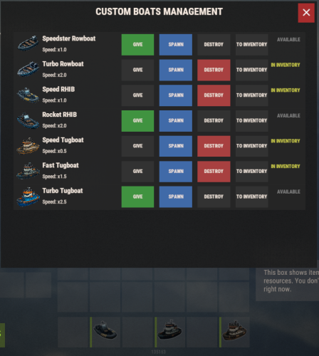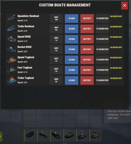 - Custom boat types: Rowboat, RHIB, Tugboat — each with its own speed multiplier and permission.