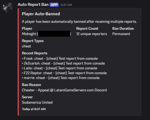 - **Reports threshold**: The number of unique reports a player must receive within the time window to trigger a ban