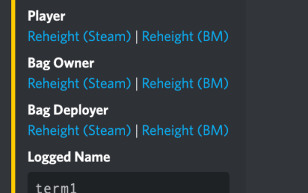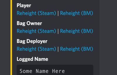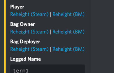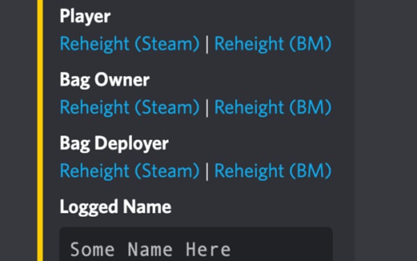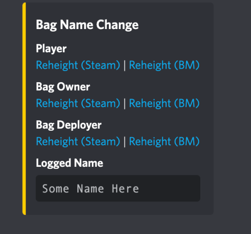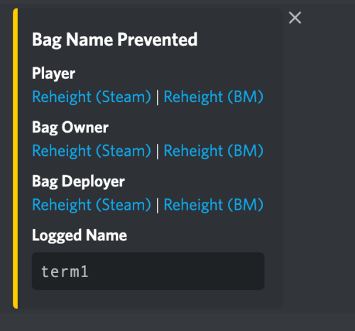 { "Chat": { "Prefix": "<color=red>BagMonitor:</color>" }, "Logging": { // Logs all name changes excluding names flagged by blacklisting filter, you can log those separately "Enabled": false, "Discord": { "Enabled": false, "Webhook URL": "URL HERE", "Embed Color": "#FFCC00" }, "Console": { "Enabled": false } }, "Blacklisting": { // Prevent names from being used in bags "Enabled": false, "Blacklist Terms (Simple)": { // This is on a word by word basis, this cannot be a sentence only a word "Enabled": false, "Blacklisted Terms": [ "term1", "term2", "term3" ] }, "Blacklist REGEX (Advanced)": { // This is an advanced checker and checks the entire string "Enabled": false, "Blacklisted REGEXs": [ "REGEX1", "REGEX2", "REGEX3" ] }, "Leet Conversion (Advanced)": { // Converts known "Leet" code (special characters that look like letters) to the letters they intend to represent, Do not play with this unless you know what you are doing as it can cause conflicts between replaces "Enabled": true, "Leet Table": { "}{": "h", "|-|": "h", "]-[": "h", "/-/": "h", "|{": "k", "/\\/\\": "m", "|\\|": "n", "/\\/": "n", "()": "o", "[]": "o", "vv": "w", "\\/\\/": "w", "><": "x", "2": "z", "4": "a", "@": "a", "8": "b", "b": "b", "(": "c", "<": "c", "{": "c", "3": "e", "€": "e", "6": "g", "9": "g", "&": "g", "#": "h", "$": "s", "7": "t", "|": "l", "1": "i", "!": "i", "0": "o" } }, "Logging": { // This will log only the flagged bag changes and prevent the name change of the bag "Enabled": false, "Discord": { "Enabled": false, "Webhook URL": "URL HERE", "Embed Color": "#FFCC00" }, "Console": { "Enabled": false } } } }