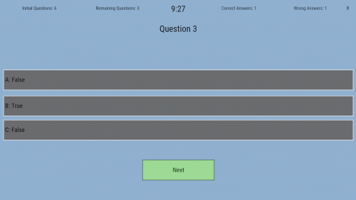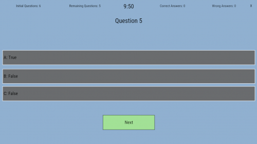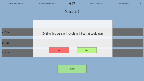 { "Items to give ": { "shortname": 10 }, "Enable Welcome Screen": true, "Main Welcome Text": "Main Text", "Enable Secondary Text": true, "Secondary Welcome Text": "Secondary Text", "Amount of questions in the quiz ": 6, "Amount of wrong answers until fail": 3, "Enable Timer": true, "Countdown timer (in seconds)": 600, "Cooldown time for failing/exiting/finising the quiz (in hours)": 1, "Questions": [ { "The question": "Question 1", "The answers": [ "True", "False", "False" ], "The correct answer": "True" }, { "The question": "Question 2", "The answers": [ "False", "True", "False" ], "The correct answer": "True" }, { "The question": "Question 3", "The answers": [ "False", "True", "False" ], "The correct answer": "True" }, { "The question": "Question 4", "The answers": [ "False", "False", "True" ], "The correct answer": "True" }, { "The question": "Question 5", "The answers": [ "True", "False", "False" ], "The correct answer": "True" }, { "The question": "Question 6", "The answers": [ "False", "True", "True" ], "The correct answer": "True" } ] }