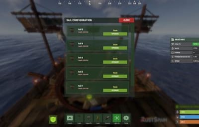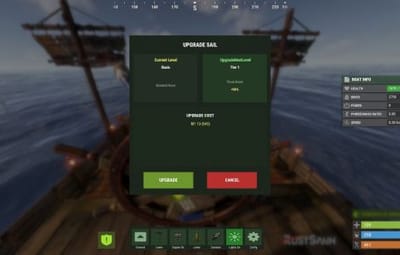 - Added a button that allows upgrading sails by levels (thrust power). Everything is configurable, including upgrade costs (in-game resources, RP, or Economy). This allows admins to add as many levels as they want in the config.