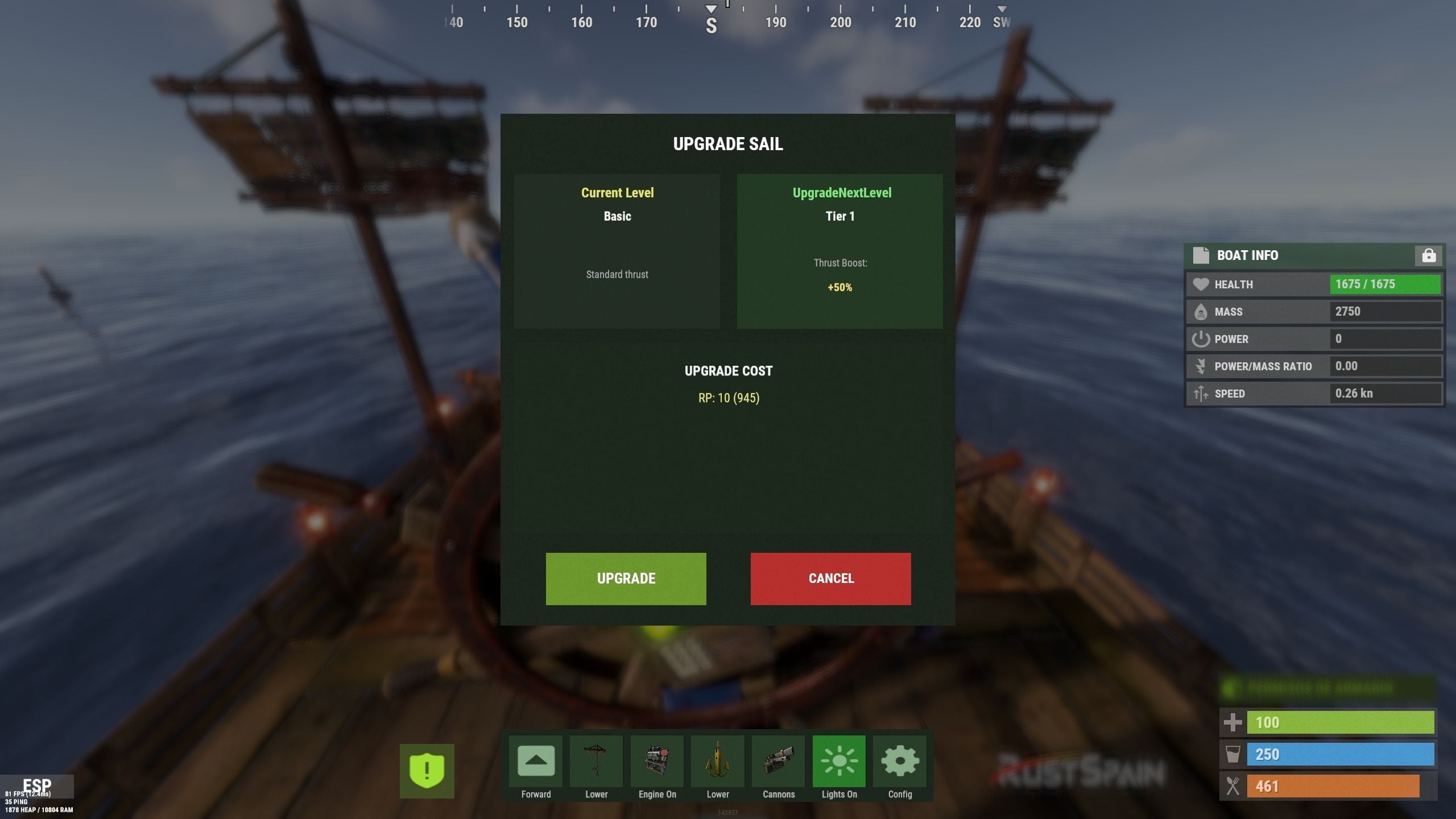 - Added a button that allows upgrading sails by levels (thrust power). Everything is configurable, including upgrade costs (in-game resources, RP, or Economy). This allows admins to add as many levels as they want in the config.