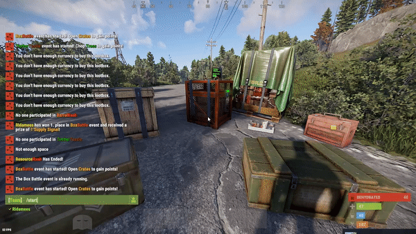{ "Only Command Start Event": false, "Minimum Players To Start Event": 1, "Show Leaderboard": true, "Leaderboard Location (top right, top center, top left | left center, right center | bottom left)": "top right", "How long will Event last (seconds)": 180.0, "How often will the event be launched(Seconds)": 1200.0, "Show Event GameTip Notifications": true, "Shown GameTip Duration (seconds)": 7.0, "Show Event Chat Notifications": true, "Notification of Event Start(Chat and GameTip)": "<color=#f7b731>Box</color><color=#e25822>Battle</color> event has started! Open <color=#f7b731>Crates</color> to gain points!", "Notification When nobody participates in the event": "No one participated in <color=#f7b731>Box</color><color=#e25822>Battle</color>", "Notification Sound of Event Start": true, "Winner Multiple Announcements Delay(seconds)": 3.0, "Box Types and Points Amount": { "crate_elite": 1, "crate_basic": 1, "crate_tools": 1, "bradley_crate": 1, "heli_crate": 1, "codelockedhackablecrate": 1, "codelockedhackablecrate_oilrig": 1, "crate_normal": 1, "crate_normal_2": 1, "crate_normal_2_food": 1, "crate_normal_2_medical": 1, "crate_food_1": 1, "crate_food 2": 1, "crate_fuel": 1, "crate_medical": 1, "supply_drop": 1, "vehicle_parts": 1, "crate_mine": 1 }, "Winner Rewards, make sure to change each value to your liking(1-6)": { "1": { "Reward Enabled": true, "Reward Type (1 = Item, 2 = Command, 3 = Economics(Plugin REQ), 4 = ServerRewards(Plugin REQ)": 1, "Reward Item": "scrap", "Reward Item Amount": 420, "Reward Item Custom Name": "", "Reward Item Skin ID": 0, "Reward Command": "oxide.usergroup add {player.id} vip", "Reward Command Display Name (Chat and GameTip)": "VIP", "Reward Economics Display Name (Chat and GameTip)": "Balance", "Reward ServerRewards Display Name (Chat and GameTip)": "RP", "Reward Economics Plugin Amount": 420.0, "Reward ServerRewards Plugin Amount": 420, "Notification of Who Won (supports {player_name}, {reward_display_name}, {crates_destroyed})": "<color=yellow>{player_name}</color> has won 1. place in <color=#f7b731>Box</color><color=#e25822>Battle</color> event and received a prize of <color=#f7b731>{reward_display_name}</color>!" }, "2": { "Reward Enabled": false, "Reward Type (1 = Item, 2 = Command, 3 = Economics(Plugin REQ), 4 = ServerRewards(Plugin REQ)": 1, "Reward Item": "scrap", "Reward Item Amount": 420, "Reward Item Custom Name": "", "Reward Item Skin ID": 0, "Reward Command": "oxide.usergroup add {player.id} vip", "Reward Command Display Name (Chat and GameTip)": "VIP", "Reward Economics Display Name (Chat and GameTip)": "Balance", "Reward ServerRewards Display Name (Chat and GameTip)": "RP", "Reward Economics Plugin Amount": 420.0, "Reward ServerRewards Plugin Amount": 420, "Notification of Who Won (supports {player_name}, {reward_display_name}, {crates_destroyed})": "<color=yellow>{player_name}</color> has won 1. place in <color=#f7b731>Box</color><color=#e25822>Battle</color> event and received a prize of <color=#f7b731>{reward_display_name}</color>!" }, "3": { "Reward Enabled": false, "Reward Type (1 = Item, 2 = Command, 3 = Economics(Plugin REQ), 4 = ServerRewards(Plugin REQ)": 1, "Reward Item": "scrap", "Reward Item Amount": 420, "Reward Item Custom Name": "", "Reward Item Skin ID": 0, "Reward Command": "oxide.usergroup add {player.id} vip", "Reward Command Display Name (Chat and GameTip)": "VIP", "Reward Economics Display Name (Chat and GameTip)": "Balance", "Reward ServerRewards Display Name (Chat and GameTip)": "RP", "Reward Economics Plugin Amount": 420.0, "Reward ServerRewards Plugin Amount": 420, "Notification of Who Won (supports {player_name}, {reward_display_name}, {crates_destroyed})": "<color=yellow>{player_name}</color> has won 1. place in <color=#f7b731>Box</color><color=#e25822>Battle</color> event and received a prize of <color=#f7b731>{reward_display_name}</color>!" }, "4": { "Reward Enabled": false, "Reward Type (1 = Item, 2 = Command, 3 = Economics(Plugin REQ), 4 = ServerRewards(Plugin REQ)": 1, "Reward Item": "scrap", "Reward Item Amount": 420, "Reward Item Custom Name": "", "Reward Item Skin ID": 0, "Reward Command": "oxide.usergroup add {player.id} vip", "Reward Command Display Name (Chat and GameTip)": "VIP", "Reward Economics Display Name (Chat and GameTip)": "Balance", "Reward ServerRewards Display Name (Chat and GameTip)": "RP", "Reward Economics Plugin Amount": 420.0, "Reward ServerRewards Plugin Amount": 420, "Notification of Who Won (supports {player_name}, {reward_display_name}, {crates_destroyed})": "<color=yellow>{player_name}</color> has won 1. place in <color=#f7b731>Box</color><color=#e25822>Battle</color> event and received a prize of <color=#f7b731>{reward_display_name}</color>!" }, "5": { "Reward Enabled": false, "Reward Type (1 = Item, 2 = Command, 3 = Economics(Plugin REQ), 4 = ServerRewards(Plugin REQ)": 1, "Reward Item": "scrap", "Reward Item Amount": 420, "Reward Item Custom Name": "", "Reward Item Skin ID": 0, "Reward Command": "oxide.usergroup add {player.id} vip", "Reward Command Display Name (Chat and GameTip)": "VIP", "Reward Economics Display Name (Chat and GameTip)": "Balance", "Reward ServerRewards Display Name (Chat and GameTip)": "RP", "Reward Economics Plugin Amount": 420.0, "Reward ServerRewards Plugin Amount": 420, "Notification of Who Won (supports {player_name}, {reward_display_name}, {crates_destroyed})": "<color=yellow>{player_name}</color> has won 1. place in <color=#f7b731>Box</color><color=#e25822>Battle</color> event and received a prize of <color=#f7b731>{reward_display_name}</color>!" }, "6": { "Reward Enabled": false, "Reward Type (1 = Item, 2 = Command, 3 = Economics(Plugin REQ), 4 = ServerRewards(Plugin REQ)": 1, "Reward Item": "scrap", "Reward Item Amount": 420, "Reward Item Custom Name": "", "Reward Item Skin ID": 0, "Reward Command": "oxide.usergroup add {player.id} vip", "Reward Command Display Name (Chat and GameTip)": "VIP", "Reward Economics Display Name (Chat and GameTip)": "Balance"