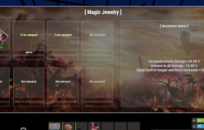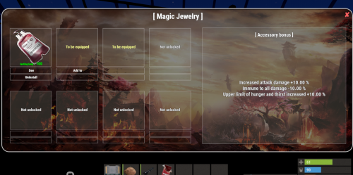 { "Jewelry settings": [ { "Item skinID": 0, "Permission required": "", "Item Short Name": "blood", "Item Name": "Buff Jewelry 0", "Minimum durability": 1, "Maximum durability": 100, "Function settings": [ { "Function number": 0, "Related values": 0.1, "Possess permissions": "", "Permission Description": "" }, { "Function number": 1, "Related values": 0.1, "Possess permissions": "", "Permission Description": "" }, { "Function number": 3, "Related values": 0.1, "Possess permissions": "", "Permission Description": "" } ] }, { "Item skinID": 1, "Permission required": "", "Item Short Name": "blood", "Item Name": "Buff Jewelry 1", "Minimum durability": 1, "Maximum durability": 100, "Function settings": [ { "Function number": 0, "Related values": 0.1, "Possess permissions": "", "Permission Description": "" }, { "Function number": 1, "Related values": 0.1, "Possess permissions": "", "Permission Description": "" }, { "Function number": 3, "Related values": 0.1, "Possess permissions": "", "Permission Description": "" } ] }, { "Item skinID": 2, "Permission required": "", "Item Short Name": "blood", "Item Name": "Buff Jewelry 2", "Minimum durability": 1, "Maximum durability": 100, "Function settings": [ { "Function number": 0, "Related values": 0.1, "Possess permissions": "", "Permission Description": "" }, { "Function number": 1, "Related values": 0.1, "Possess permissions": "", "Permission Description": "" }, { "Function number": 3, "Related values": 0.1, "Possess permissions": "", "Permission Description": "" } ] } ], "Function Description": [ { "Function number": 0, "Function Description": "Increased attack damage", "Display Editing": "Increased attack damage +{0:P}" }, { "Function number": 1, "Function Description": "Immune to all damage", "Display Editing": "Immune to all damage -{0:P}" }, { "Function number": 2, "Function Description": "Maximum HP increased", "Display Editing": "Maximum HP increased +{0:P}" }, { "Function number": 3, "Function Description": "Upper limit of hunger and thirst increased", "Display Editing": "Upper limit of hunger and thirst increased +{0:P}" }, { "Function number": 4, "Function Description": "Hunger limit increased", "Display Editing": "Hunger limit increased +{0:P}" }, { "Function number": 5, "Function Description": "Attack Vampire Increase", "Display Editing": "Attack Vampire Increase +{0:P}" }, { "Function number": 6, "Function Description": "Increased critical strike multiple", "Display Editing": "Increased critical strike multiple +{0:P}" }, { "Function number": 7, "Function Description": "Increase in magazine fold", "Display Editing": "Increase in magazine fold +{0:P}" }, { "Function number": 8, "Function Description": "Automatically restore health", "Display Editing": "Automatically restore health +{0}" }, { "Function number": 9, "Function Description": "Increase in resource multiplier", "Display Editing": "Increase in resource multiplier +{0:P}" }, { "Function number": 10, "Function Description": "Immune to cold damage", "Display Editing": "Immune to cold damage -{0:P}" }, { "Function number": 11, "Function Description": "Immune radiation damage", "Display Editing": "Immune radiation damage -{0:P}" }, { "Function number": 12, "Function Description": "Immune to drowning injuries", "Display Editing": "Immune to drowning injuries -{0:P}" }, { "Function number": 13, "Function Description": "Immune to heat damage", "Display Editing": "Immune to heat damage -{0:P}" }, { "Function number": 14, "Function Description": "Immune to bleeding damage", "Display Editing": "Immune to bleeding damage -{0:P}" }, { "Function number": 15, "Function Description": "Immune poisoning damage", "Display Editing": "Immune poisoning damage -{0:P}" }, { "Function number": 16, "Function Description": "Immune to bullet damage", "Display Editing": "Immune to bullet damage -{0:P}" }, { "Function number": 17, "Function Description": "Immune to sword damage", "Display Editing": "Immune to sword damage -{0:P}" }, { "Function number": 18, "Function Description": "Immune to blunt instrument damage", "Display Editing": "Immune to blunt instrument damage -{0:P}" }, { "Function number": 19, "Function Description": "Immune to drop damage", "Display Editing": "Immune to drop damage -{0:P}" }, { "Function number": 20, "Function Description": "Immune to bite damage", "Display Editing": "Immune to bite damage -{0:P}" }, { "Function number": 21, "Function Description": "Immune to Spike Damage", "Display Editing": "Immune to Spike Damage -{0:P}" }, { "Function number": 22, "Function Description": "Immune to explosive damage", "Display Editing": "Immune to explosive damage -{0:P}" }, { "Function number": 23, "Function Description": "Immune to current damage", "Display Editing": "Immune to current damage -{0:P}" }, { "Function number": 24, "Function Description": "Immune to arrow damage", "Display Editing": "Immune to arrow damage -{0:P}" }, { "Function number": 25, "Function Description": "Immune to direct damage from heli", "Display Editing": "Immune to direct damage from heli -{0:P}" }, { "Function number": 26, "Function Description": "Immune to tank damage", "Display Editing": "Immune to tank damage -{0:P}" }, { "Function number": 100, "Function Description": "Obtain permissions", "Display Editing": "{0}" } ], "General Settings": { "Player Chat Command": "sp", "Administrator commands": "spgive", "UI Title": "<b>[ Magic Jewelry ]</b>", "UI background image": "BuffItems.png", "Second regeneration interval per second": 1, "Endurance consumption interval seconds (0Disabled for)": 600, "Default Critical Hit Probability": 2, "Player Critical Strike and Permissions": [ { "limits of authority": "BuffItems.hit1", "probability": 3 }, { "limits of authority": "BuffItems.hit2", "probability": 5 }, { "limits of authority": "BuffItems.hit3", "probability": 10 } ], "The default number of accessories that players can equip": 3, "Allow equipment quantity and permissions": [ { "limits of authority": "BuffItems.vip1",