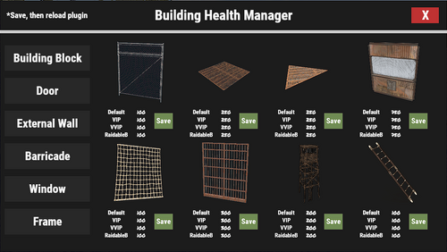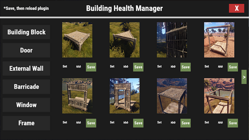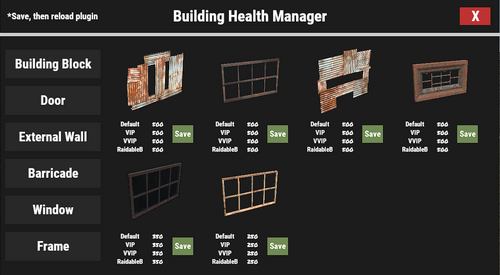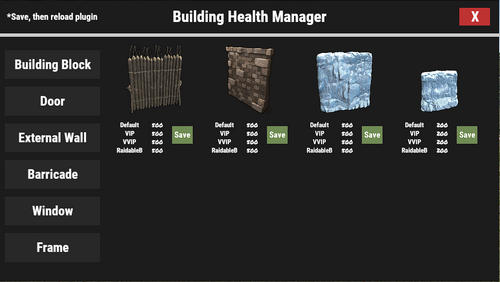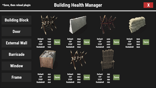The main objective of the plugin is to allow server administrators to individually adjust the health of constructions such as building blocks, doors, external walls, barricades, windows, and frames.