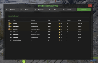 The Leaderboard ranks every player on the server by reputation, alongside their business type, missions completed, and total earnings.